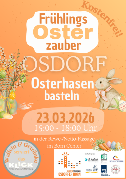 Am Montag, den 23.03.2026 veranstaltet der Stadtteiltourismus Osdorfer Born mit der Unterstützung durch das Team von TuscheTiger eine Osterhasen Bastelaktion im Borncenter und heißt dabei Jung und Alt willkommen, sich kreativ auszutoben. Hier habt ihr von 15 bis 18 Uhr Zeit eure bunt gestalteten Hasen mit den verschiedenen Materialien und dem Bastelzubehör zu verschönern. Jeder Hase wird zu einem kleinen Unikat!